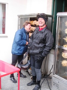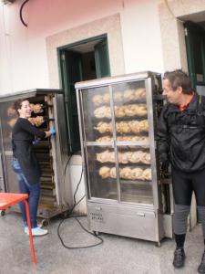 Fomos então a outro mais perto da capela, que penso chamar-se Solar Senhor da Pedra, daqueles que tem máquinas de assar frangos na rua, com duas simpáticas meninas, de belos sorrisos, muito admiradas com tantos pedalistas, alegres e bem dispostos, apesar de bem molhadinhos.