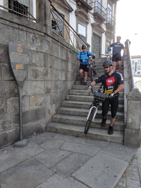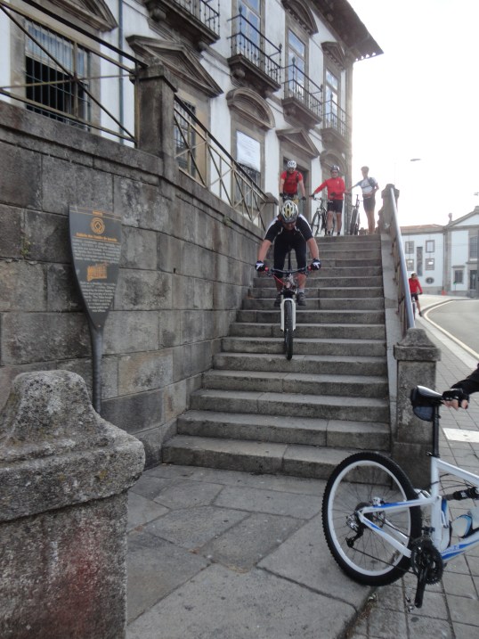Audazes para vencer os degraus das escadas, que optamos por descer, montados nas suas meninas, só os meninos Jorge Bastos e Sérgio Caban nos brindaram com tal feito, tendo todos os restantes achado melhor que não valia a pena estar a estragar a manhã com quedas desnecessárias, até porque, momentos antes, já o Mário se tinha atirado para os paralelos, na confusão que se gerou, quando a malta parou, ao chegarmos às escadas.