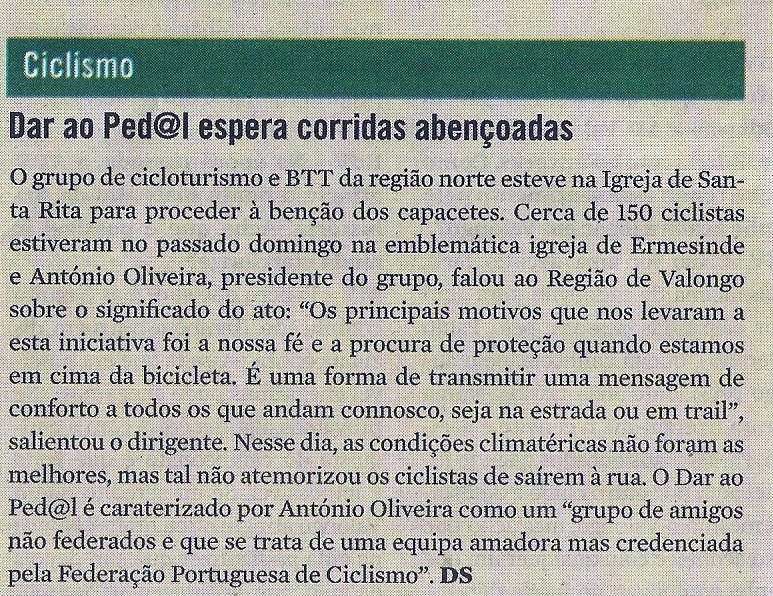 Notícia publicada no jornal “Região de Valongo”, no dia 27-11-2014, sobre a Bênção dos Capacetes, na Igreja de Santa Rita, Ermesinde, evento realizado pelo grupo Dar ao Ped@L.