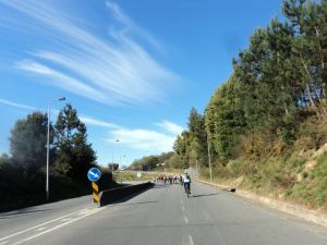 Já fora da cidade, passamos por Padrão da Légua, Leça do Balio e um pouco antes de passarmos no cruzamento de Moreira da Maia, perdemos o rasto às setas e enganamo-nos no caminho e seguimos a estrada para o aeroporto, tendo pedalado pelo menos mais uns seis km até voltarmos ao ponto correcto.