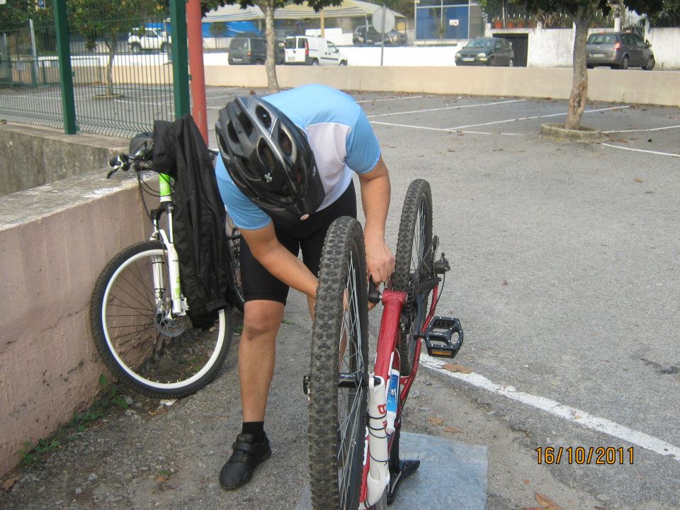 Chegados ao local estipulado ( barragem de Crestuma) a paragem obrigatória para o Café da manhã, fazer um mudança dos pedais da bike do Oliveira. aliás mais uma modificação de muitas já feitas pelo grupo.