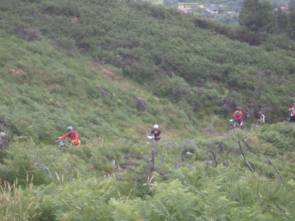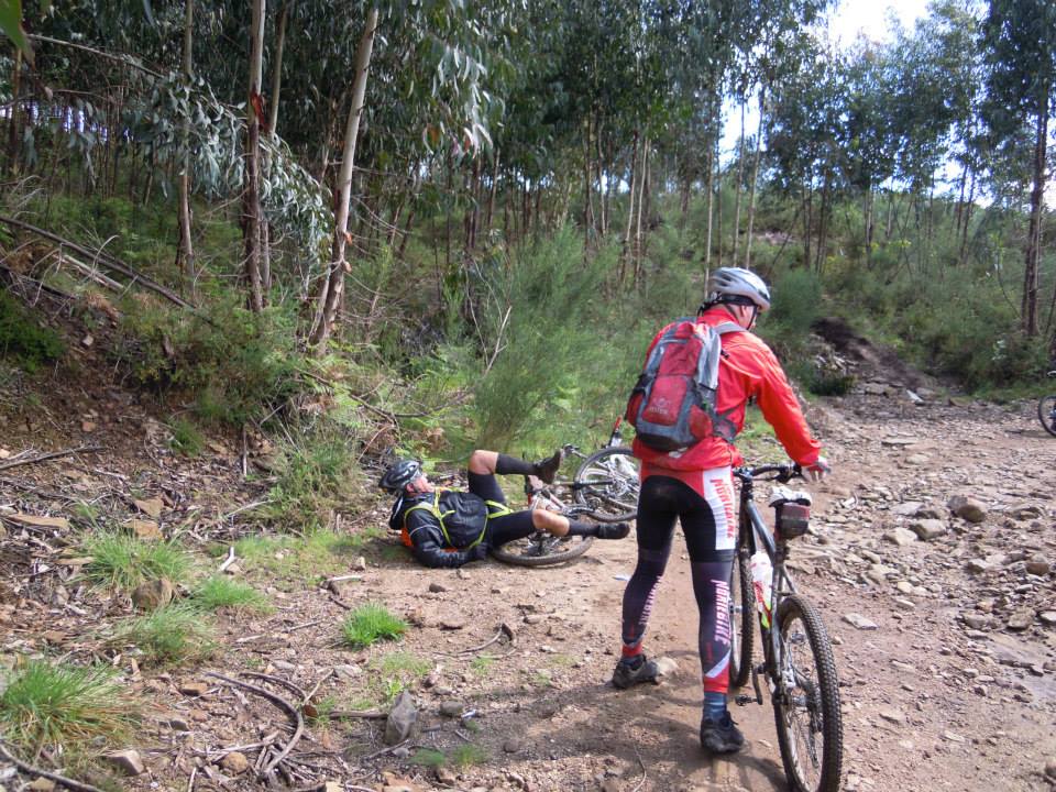 Continuámos… mas a verdade, é que aquela coisa do Ricardo mexeu comigo, não contente com o caso e por entre paisagens e trilhos de cortar a respiração, numa subida fantástica, resolvi fazer um ligeiro cavalinho, só que o trilho desapareceu debaixo da roda, e zás, mesmo de cabeça ao chão, directo, assim mesmo sem ensaio nem pára-quedas, fiquei a saber que afinal os capacetes sempre tem alguma utilidade, para além de embelezar a cabeça, taparem as carecas e nos causarem calor!