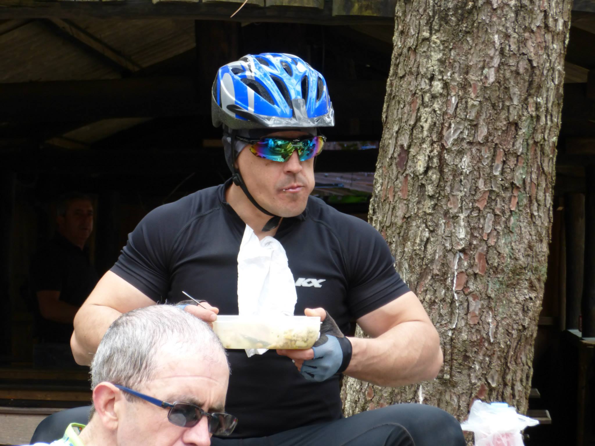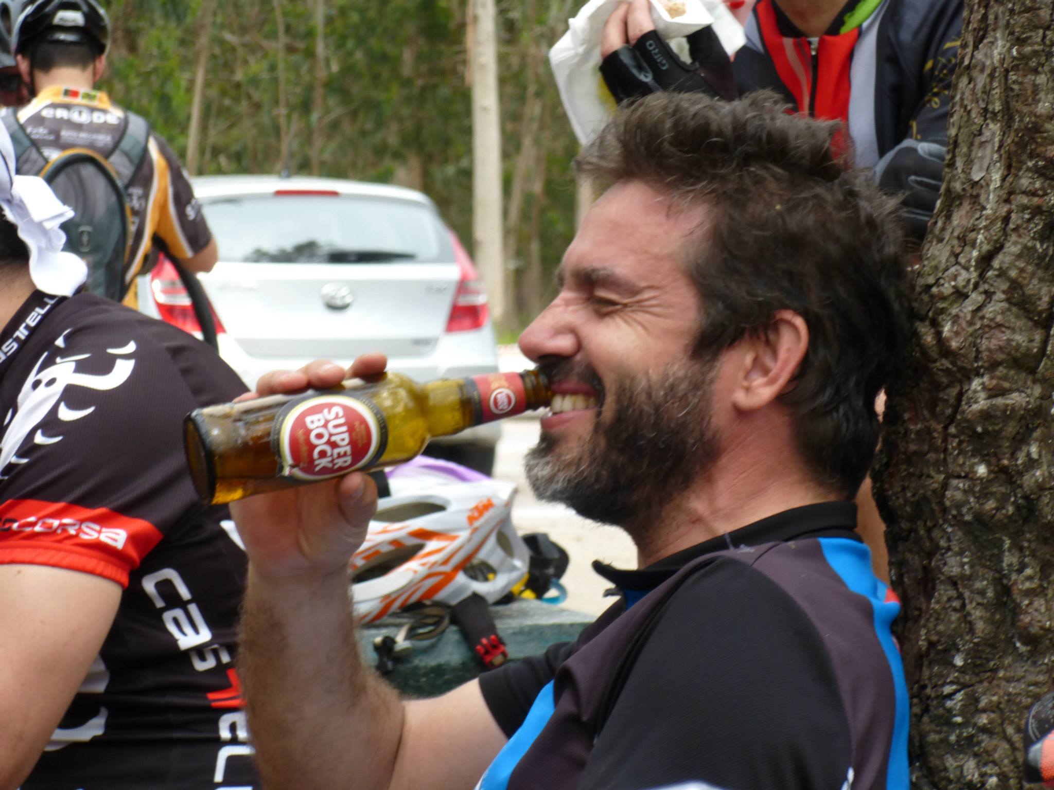 Chegados à curva onde fizemos a inversão de marcha, paramos para reagrupar uma vez mais, e eis que, resolvi protagonizar o primeiro momento da manhã, com sapatilhas e cleats novos, esqueci-me de desencaixar uma sapatilha, e claro, está mesmo a ver-se que me estatelei no chão, não contente com o caso, o Ricardo Ferreira aproveitou a deixa e ai ai ai, ai ai ai, que não me estou a sentir bem, e não é o que o rapaz tem ali mesmo uma quebra de tensão só para chamar as atenções todas para ele e ninguém ligar ao meu tombo! Água fresca, alimentos e açúcar e o Ricardo lá se restabeleceu e voltou à sua cor normal, e nós voltamos a colocar-nos em marcha, mas fica o aviso menino Ricardo, fazes o favor não voltas a ter quebras de tensão, isso não é nada pá, estive eu a ensaiar os tombos para nada!
