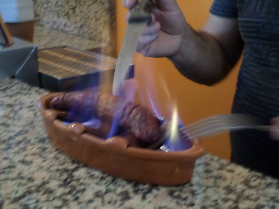 Cafézinho da praxe, acompanhado com o famoso chouriço assado no álcool…
