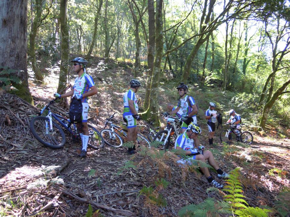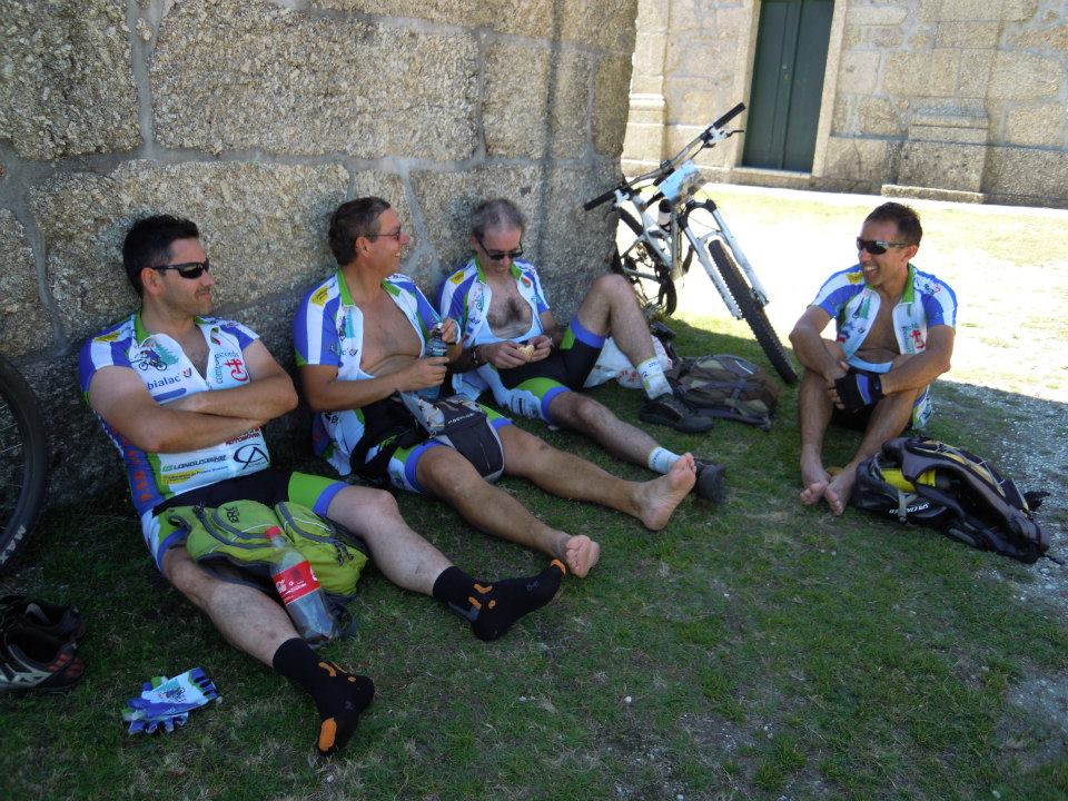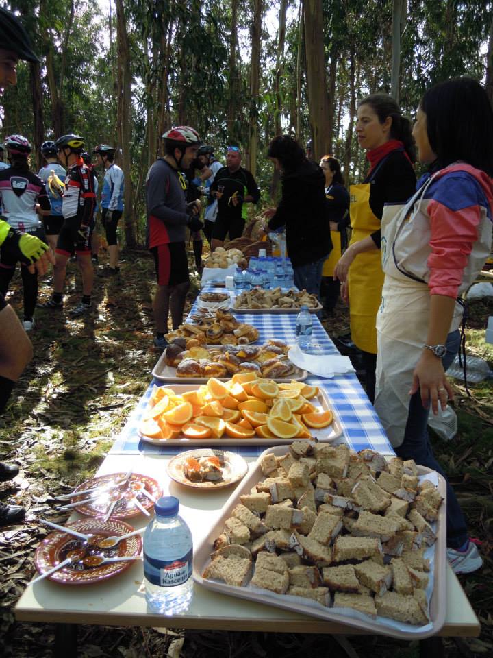 Pelo caminho, numa paragem para reforço, normal em todos os passeios, tivemos uma bela surpresa. O Magalhães, que trazia às costas uma volumosa mochila, como se estivesse num passeio de 3 dias, saca da mochila um Tuperware próprio para transporte de bolos e oferece a cada um de nós uma saborosa fatia de bolo, que alguém disse ser de alfarroba, aditivo mas próprio para equinos, mas que a todos deu energias extras para as subidas, à mão ou a pedalar.
