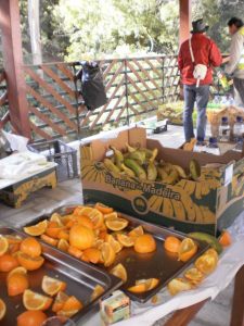 Uma mesa bem abastecida, com fruta, bananas e laranjas com fartura, bolos á descrição, pão-de-ló, marmelada, sumos e até o café e até água quente não faltou, para aquecer as bebidas.