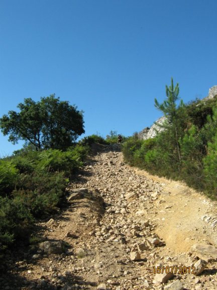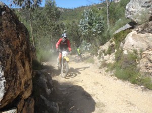 É um trilho largo, longo, sempre com inclinação pendente, que proporciona saltos, com muitos obstáculos naturais, provocados pela erosão e pela água das chuvas, mas também artificiais, desta feita deixados pelos rodados dos jipes e das motos, com as quais também nos cruzamos.