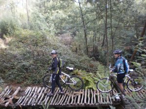 Como ainda era cedo, resolvemos atravessar a ponte sobre o rio Ferreira e fazer mais uns trilhos no lado de Pias, à aventura, virando à direita e subindo a estrada até um cruzamento onde viramos para as mais complicadas passagens desta manhã, uma subida com a bike pela mão e uma descida muito íngreme, com muito barro húmido e impossível de descer e que logo no inicio ainda provocou umas pequenas quedas a quem quis ousar descer montado.