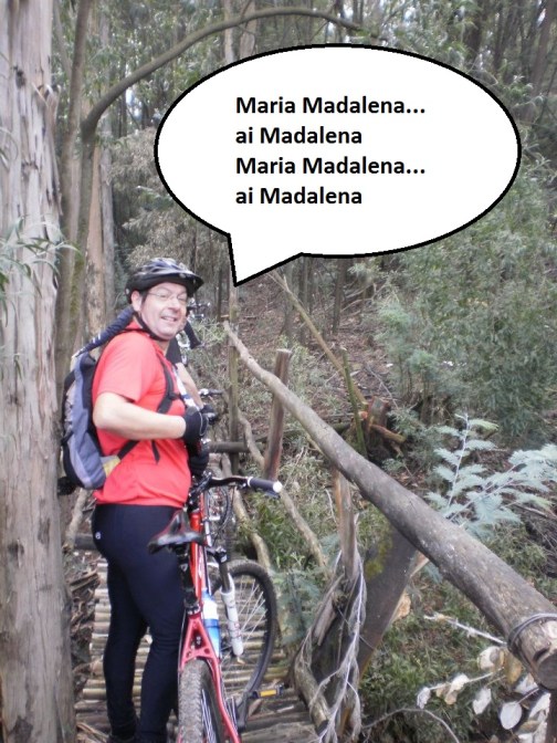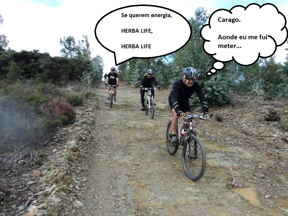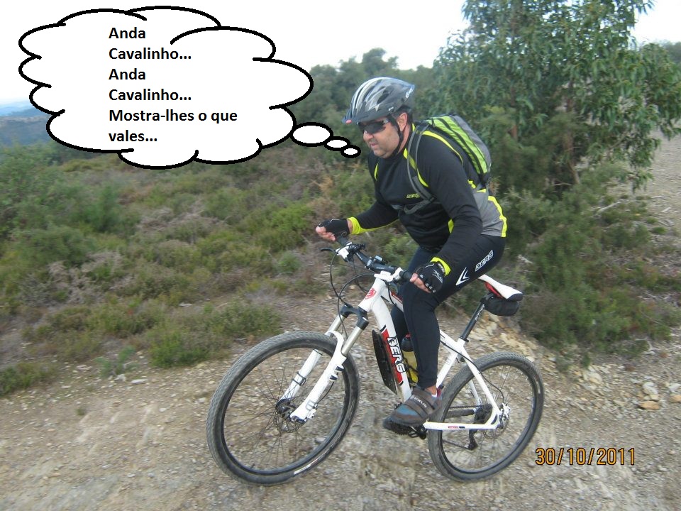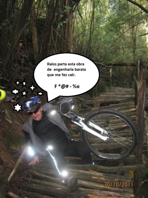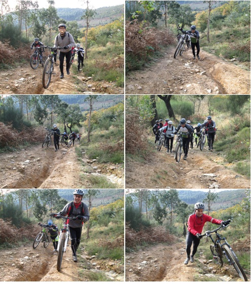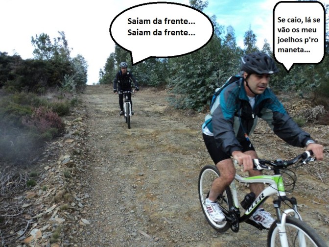 Daqui, optamos por seguir o trilho das caminhadas e não a estrada em paralelos e logo no início dá-se a queda espectacular do Mascarenhas, ao tentar ser acrobata em vez de pedalista, e arriscar passar por um caminho em forma de muro em terra e com declives em ambos os lados. Foi queda na certa e só não deu lugar a problemas de maior pois ele foi rápido a saltar e a libertar-se da bike.