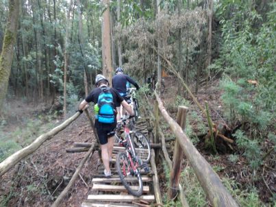 É um trilho largo, longo, sempre com inclinação pendente, que proporciona saltos, com muitos obstáculos naturais, provocados pela erosão e pela água das chuvas, mas também artificiais, desta feita deixados pelos rodados dos jipes e das motos, com as quais também nos cruzamos.